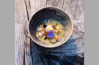 Im Tigre de Leche Dressing mit Stangensellerie vom Stechaubauer kommt das Hendl-Garum ebenso zum Einsatz wie in der Marinade der Wildmasthendlkeule und in damit veredelten Saucen. Auch Gerichten wie dem Stechaubauer-Ratatouille, Eierschwammerlgulasch, Hühnersuppe, Bouillonkartoffeln und der alpinen Ramen-Suppe verleiht es eine ganz besondere Note. Durch ein spezielles Fermentationsverfahren stellt Andreas Herbst sicher, dass auch jene Gäste mit Gluten-Unverträglichkeit bedenkenlos zugreifen können.