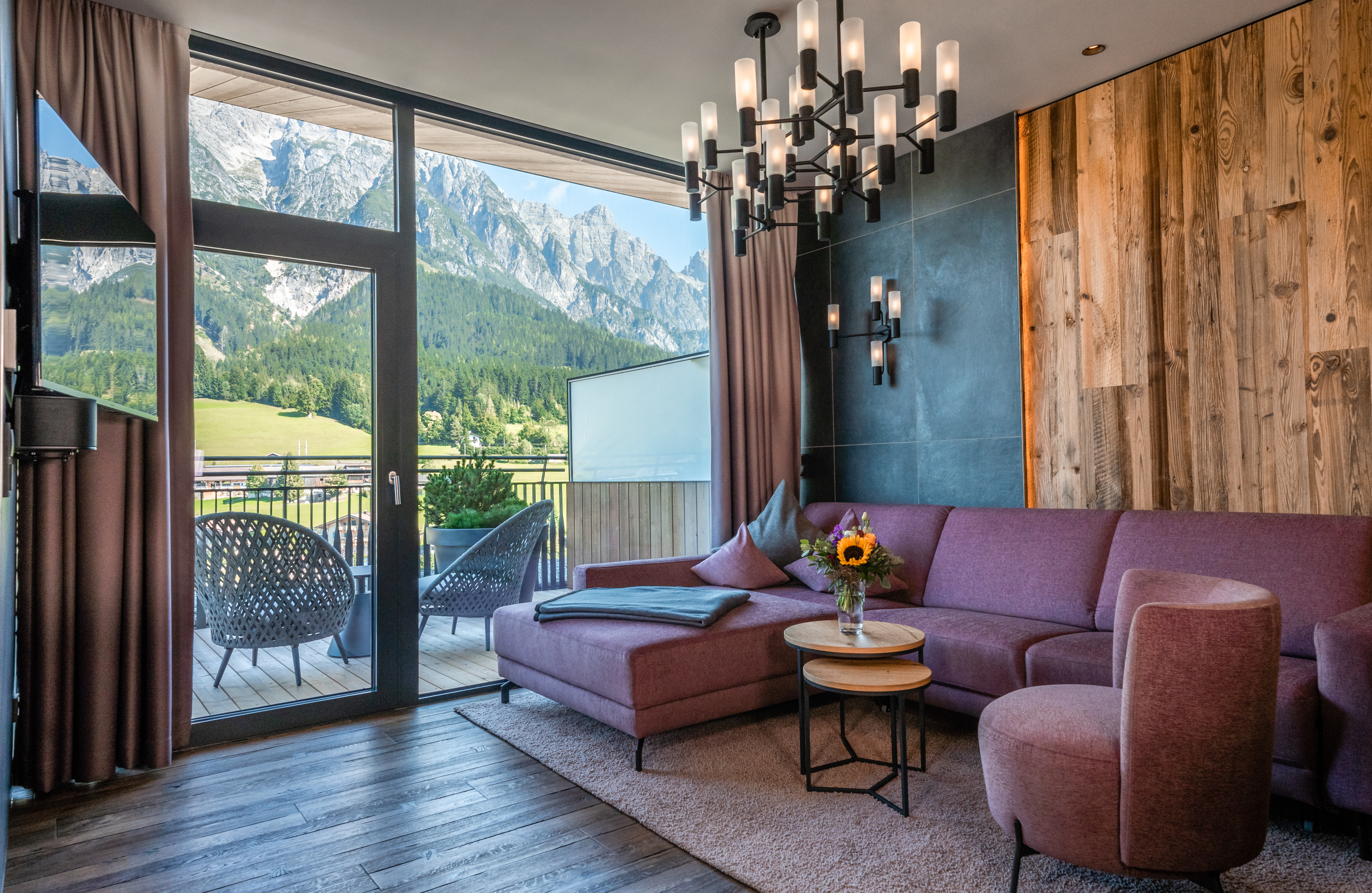 Entstanden sind dabei im Vier-Sterne-superior-Genießerhotel Riederalm in Leogang/Salzburger Land aber aus baulichen Gründen außerdem zwei außergewöhnliche Luxury Spa Penthouse-Suiten: Auf einer Fläche von rund 61 m² erwartet die Gäste nun feinste Wohnkultur mit lässig-modernem Alpin-Design aus hochwertigsten Materialien wie Altholz und anthrazitfarbenen Edelfliesen und mit Weinklimaschrank, eigener Sauna, und dank bodentiefer Panoramafenster ein fantastischer Blick auf die Leoganger Bergwelt mit dem markanten Birnhorn. Aufgrund der zackigen Gipfeltürme wird dieses Ensemble auch gerne als „Pinzgauer Dolomiten“ bezeichnet. Die große, südseitig ausgerichtete Dachterrasse unterstreicht das Wohnerlebnis.