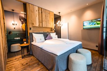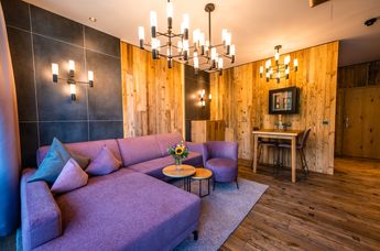 Zwei ebenfalls neuen Deluxe Familien Suiten bieten mit zwei getrennten Schlafzimmern (1 Kinderzimmer mit 2 Einzelbetten) und Wohnbereich mit offener Raumaufteilung modernes Ambiente und viel Platz für die ganze Familie.