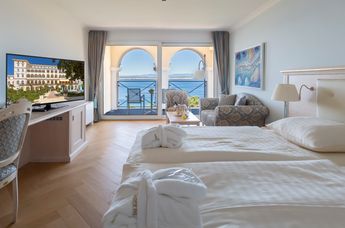 Nach der letzten Erweiterung um eine Hotelvilla mit 36 Doppelzimmern und Appartements erfolgt die Fertigstellung der nächsten Bauetappe: Ab dem Frühjahr steht den Gästen ein neuer, beheizter Meerwasserpool mit Innen- und Außenbereich zur Verfügung. 25 Meter lang, mit Liegebereich innen und außen, ist die Poollandschaft in den Neubauflügel integriert und erlaubt einen wunderbaren Ausblick auf die Parkanlage und das Meer.