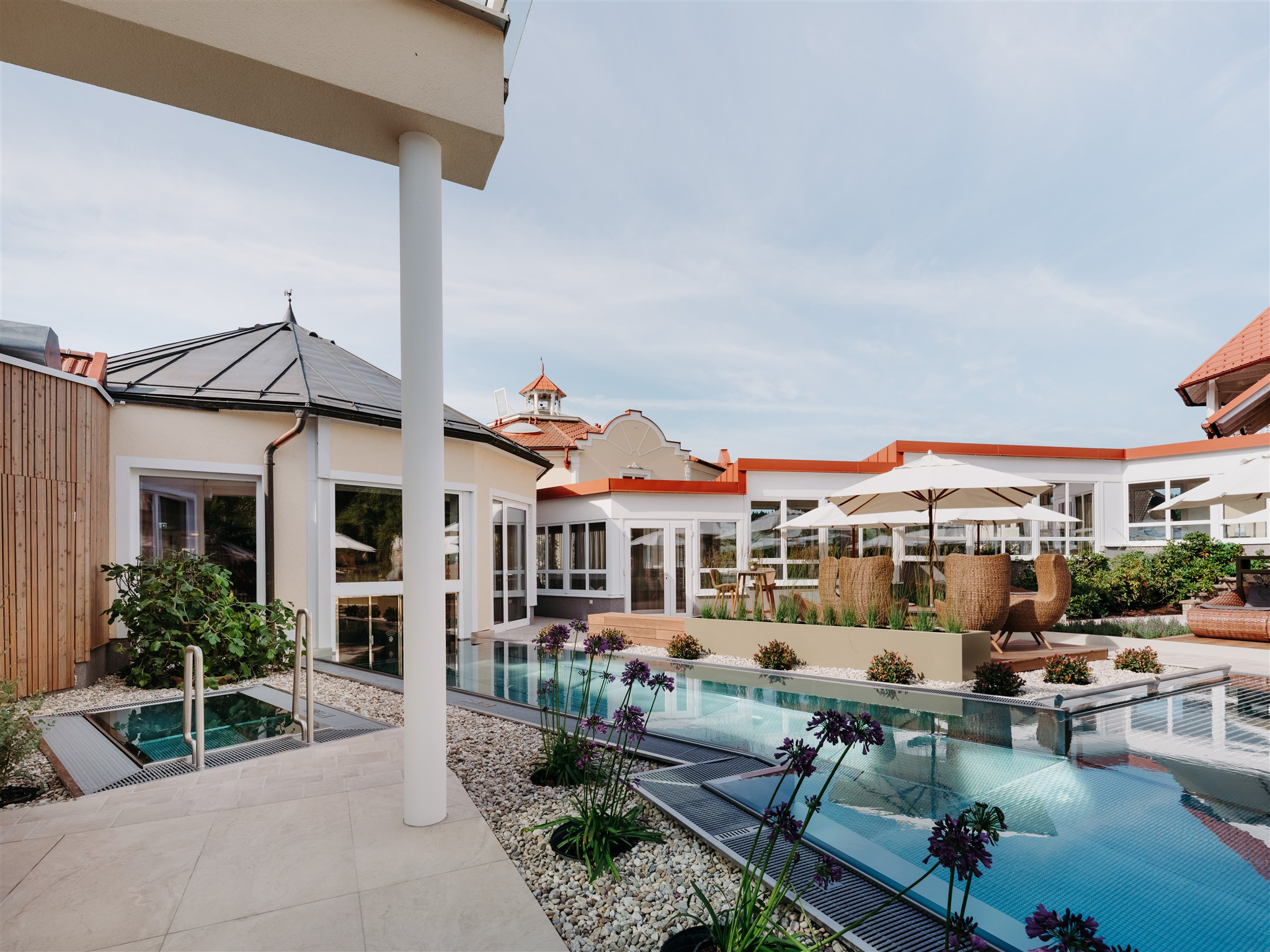 Im Mittelpunkt des neuen WaldSPA steht der In- und Outdoorpool. Der liebevoll angelegte Garten beherbergt eine Holz-Außensauna und viele kuschelige Entspannungsplätze. Der Duft frischer Kräuter aus dem eigenen Garten führt direkt in die Saunalounge mit einem SOLEUM Tee- & Sole-Dampfbad. Einen besonderen Platz zum Relaxen bieten die Liegen am Seerosen-Biotop inmitten des Lavendel-Gartens. Naturmaterialien sind die Hauptakteure und der Wald gilt als Vorbild für Erholung und Entspannung. Das SPA-Team verwöhnt mit einem ganzheitlichen Energie-Massage- & Kosmetik-Angebot.