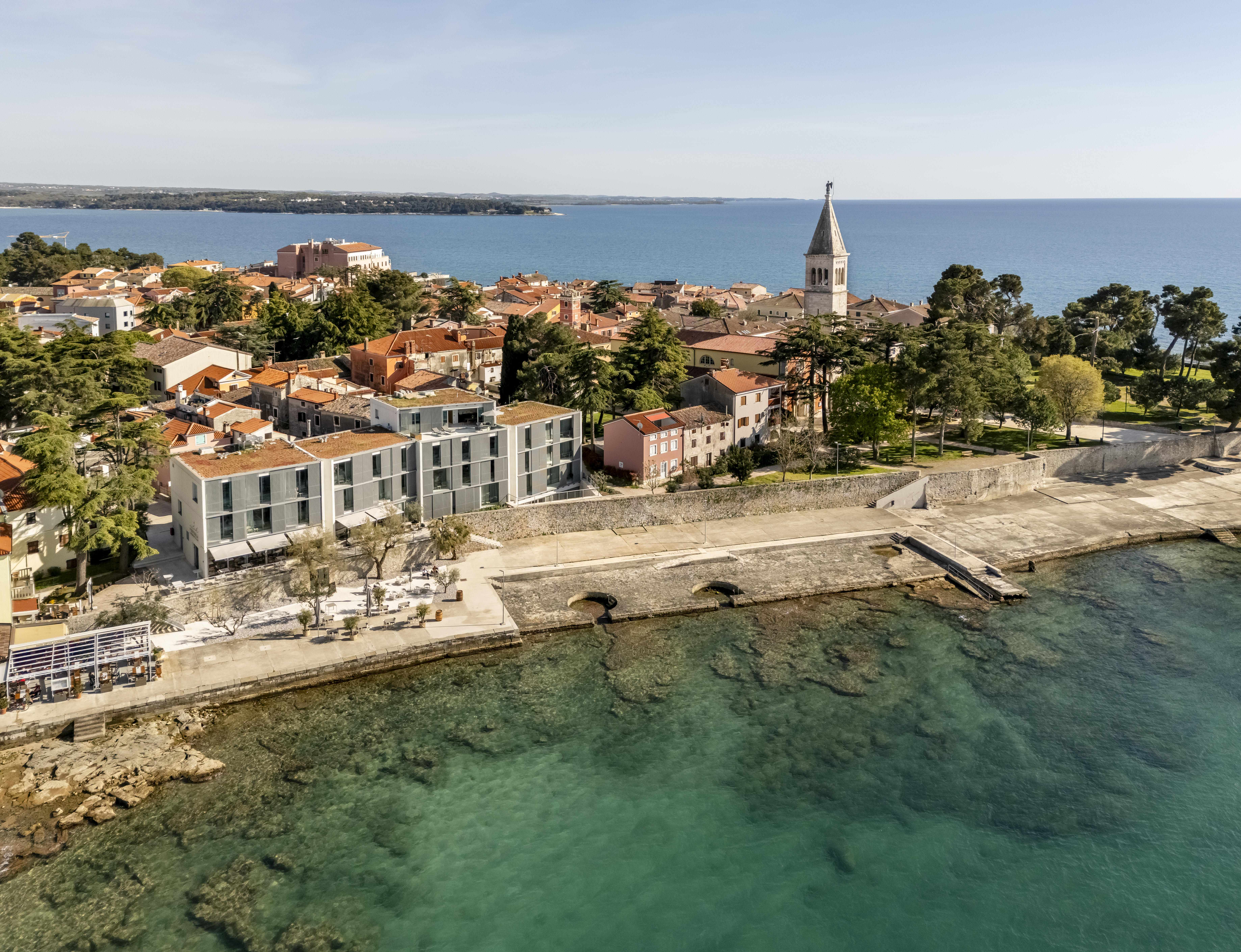 Die Lage könnte nicht grandioser sein: An der Südspitze der autofreien Altstadt-Halbinsel des Fischerstädtchen Novigrad heißt das neue Boutiquehotel Blu Mare seine Gäste willkommen. Weite offene Fensterfronten sowie modernes Design holen die Adria buchstäblich ins Haus und machen jedes der 23 Mare-Zimmer und vier Suiten zur Aussichtsbühne mit Meerblick. Und das nicht nur bei den legendären Sonnenuntergängen, für die Novigrad berühmt ist.