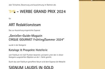 Eindrucksvoller Erfolg für die Genießerhotels & -restaurants (www.geniesserhotels.com). Das von der Salzburger Tourismus-PR-Agentur A.R.T. RedaktionsTeam zweimal jährlich produzierte Genießer-Guide-Magazin CIRQUE GOURMET „Frühling/Sommer 2024“ gewann für seine innovative Marketingkonzeption den am 12.6.2024 in Wien verliehenen T.A.I. Werbe Grand Prix 2024 in Gold in der Kategorie „Kataloge & Prospekte Hotellerie“.